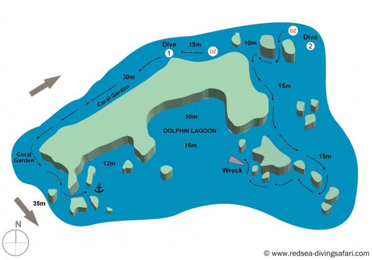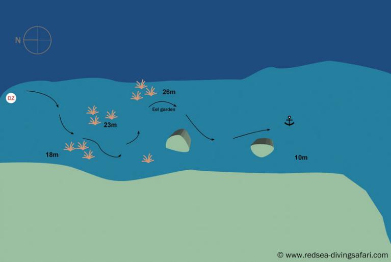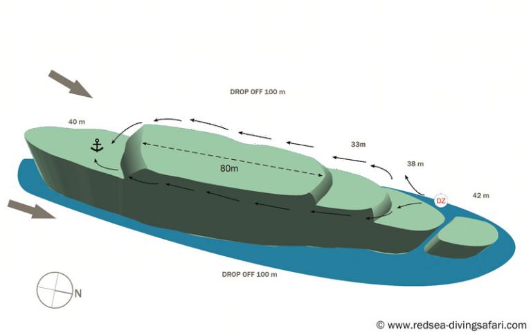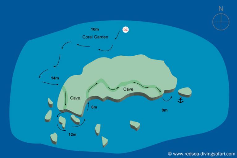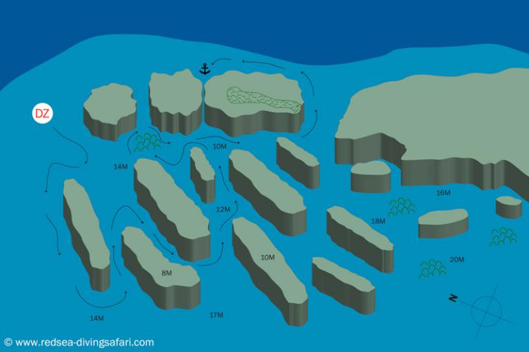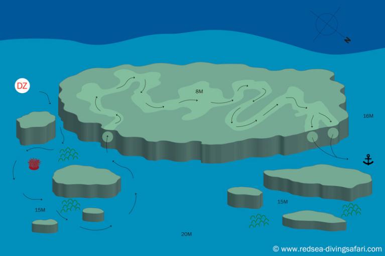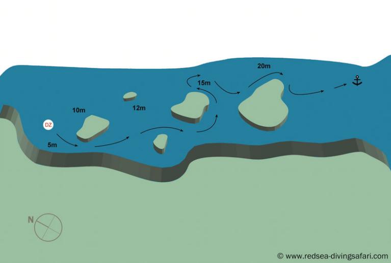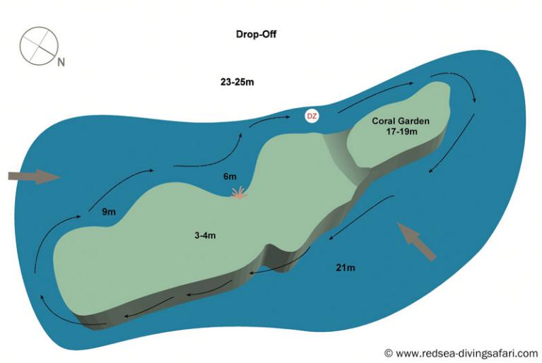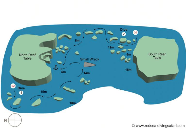Au sud, le paysage est chaotique et très intéressant avec de nombreux canyons et piliers abritant des espèces telles que des poissons-lions et de nombreux mérous. Après les coins sud ou nord du récif se trouvent de superbes jardins de corail sur de beaux tombants avec une chance de voir des espèces pélagiques et parfois des dauphins.