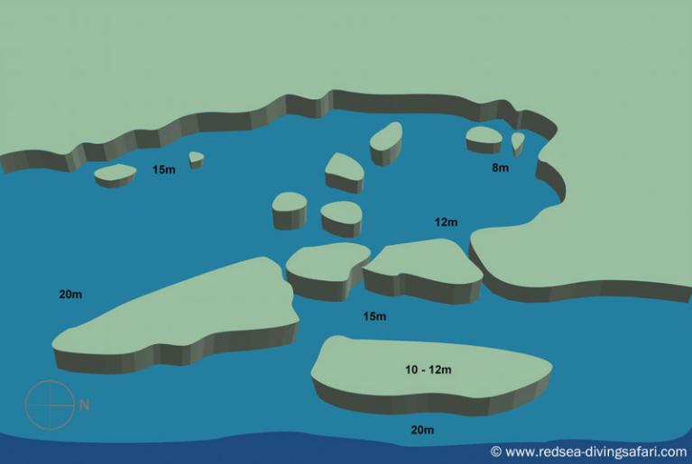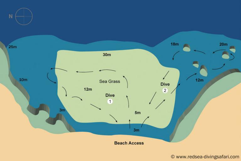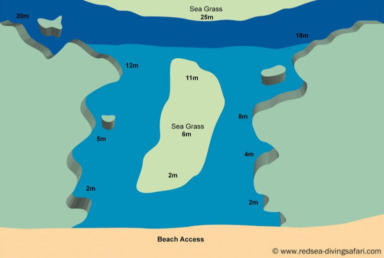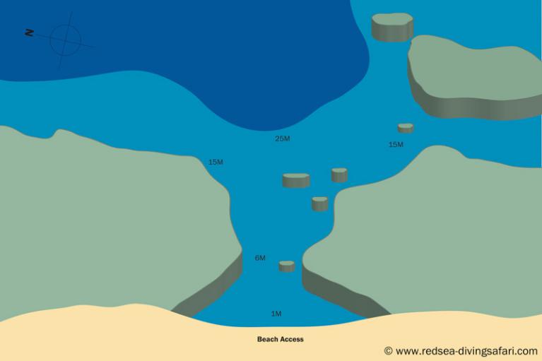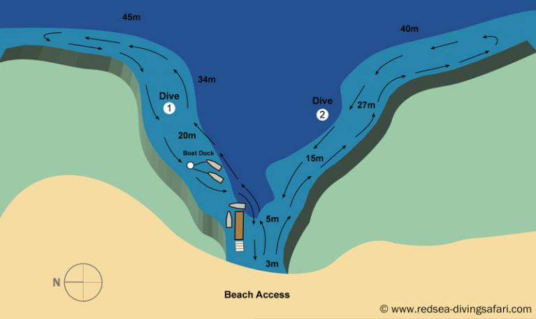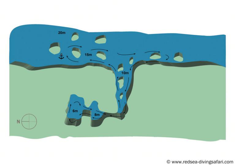Sharm Abu Dabab: "Sharm" signifie la forme en V dans les systèmes de caniveaux, bassins et grottes de récifs frangeants, ressemblant aux lèvres d'un chameau. "Abu Dabab" signifie littéralement le père de l'Echo (ou du son du désert). Sharm Abu Dabab propose un système de tunnel avec trois piscines interconnectées. Le courant peut être fort dans les tunnels et un système de corde fournit une assistance sécurisée. En sortant des canyons, vous verrez l'un des plus beaux jardins de corail du sud de la mer Rouge. Ce site peut également être réalisé comme une plongée en dérive du nord au sud pour profiter pleinement de ce jardin.