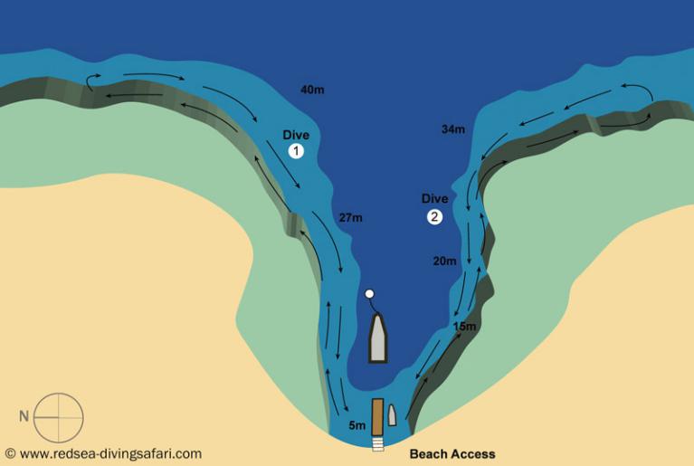 Long Canyon: Cette plongée est principalement une plongée dans un long canyon du récif nord de Shaab Abu Dabab (d'où le nom!). La plongée commence généralement du côté nord, où les plongeurs commencent par découvrir le jardin de corail à l'extérieur. Une anémone rouge se trouve près de l'entrée du canyon. Après avoir pénétré à l'intérieur, les plongeurs explorent les méandres parsemés de bassins et de grandes cavités. Le jardin de corail à l'extérieur du canyon est particulièrement beau et, en fonction votre consommation d'air, il est également possible de visiter la petite épave à la sortie du canyon.